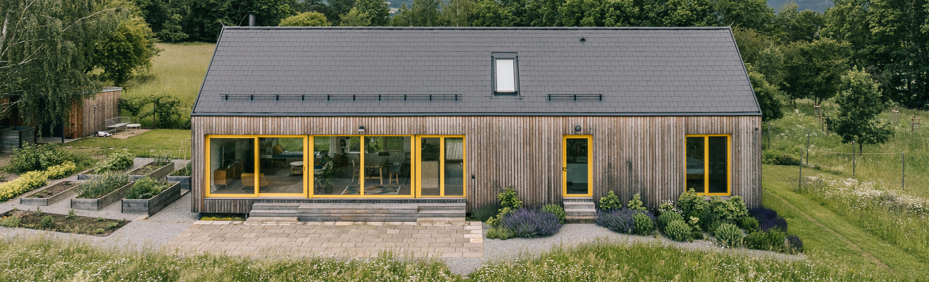 Vysoké záhony jsou vyrobené z modřínu stejně jako obložení fasády domu.