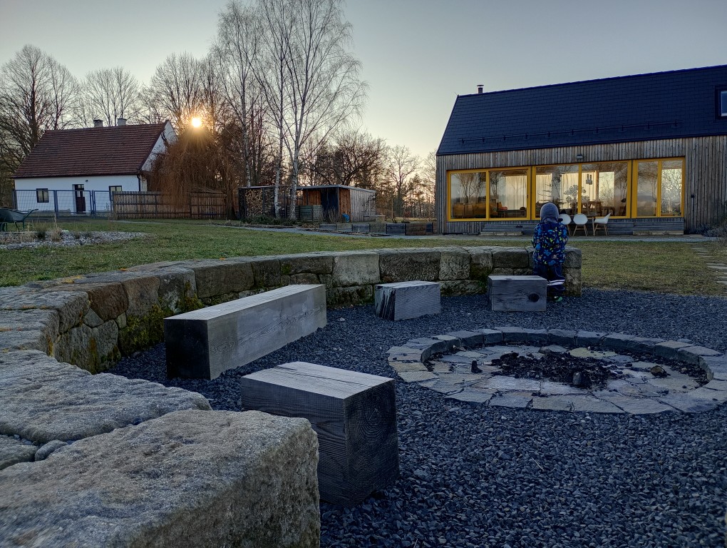 Na středu pozemku je umístěné ohniště s kruhovou na sucho skládanou zídkou okolo něj. Byly na ni využity kamenné pískovcové bloky nalezené přímo na pozemku.