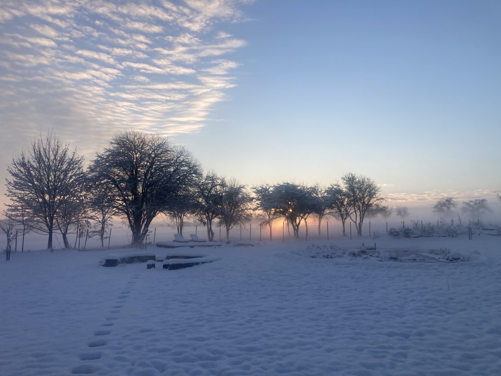 Zimní atmosféra na zahradě s ohništěm a jezírkem.
