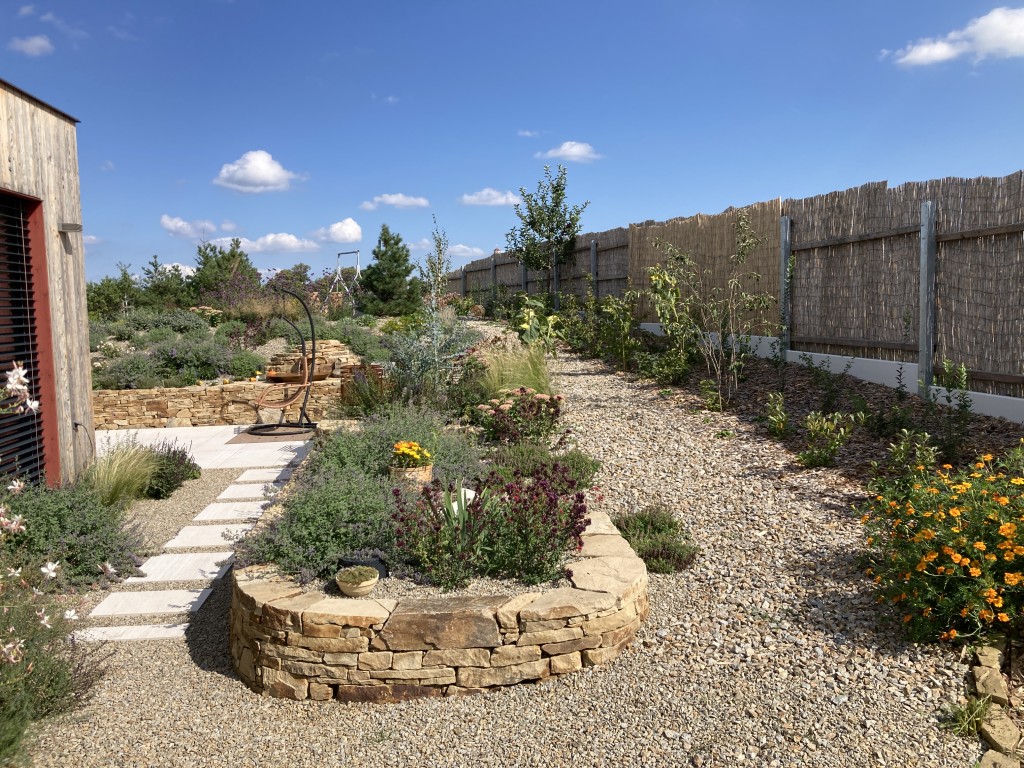 Zde trvalkové výsadby na plném slunci a výsušné půdě doplňují nasucho skládané kamenné zídky.